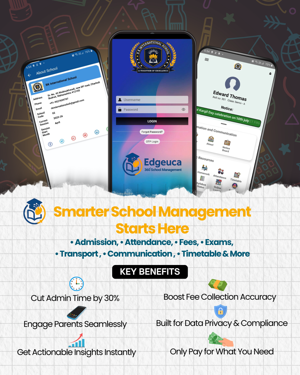 Trusted School ERP Solution in Pune. Looking for the best school management software to streamline your institution’s operations? EDGEUCA is an AI-powered School ERP designed to automate everything—from student admissions, attendance, and timetable scheduling to fee management and parent-teacher communication.